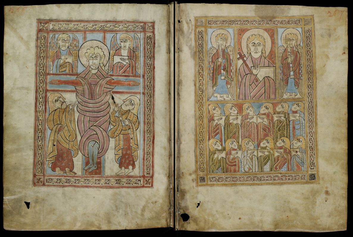 Among the 18 manuscripts being generously loaned to the National Museum by the Stiftsbibliothek (Abbey Library) in St. Gallen, Switzerland, is Cod. Sang. 51, which contains the so-called Irish Gospels of St Gall. While this beautifully illustrated Gospel-book was in the library of St. Gallen by the 10th century at the latest, it is believed to have been produced in Ireland in the second half of the 8th century, perhaps at a monastery in the Irish midlands. In addition to full-page depictions of the four Evangelists, the elaborately ornamented opening words (incipits) of their respective Gospels and a cross-carpet page, the double-page 266–267 has facing depictions of the Crucifixion and the Last Judgement. Either side of the head of Christ on the Cross is a winged angel holding a book, while below the transom of the cross he is flanked to his left by Longinus, who trusts a lance or spear into his side, and to the right by Stephaton, who holds a semi-circular or crescent-shaped vessel at the tip of a long stick to the mouth of Christ. The heads of both Longinus and Stephaton are titled backwards to gaze at Christ. Christ is depicted without a beard and wearing a long sleeveless ribboned garment. Though the wounds caused by the nailing to the cross are visible on his feet and hands, Christ’s countenance is relatively serene and a long way from the tortured and suffering Christ common in later and post-medieval representations. Peter Harbison counts Cod. Sang. 51 as the earliest surviving Irish representation of the crucifixion. It has echoes of an earlier depiction found in the Durham Gospels, probably produced at Lindisfarne in Northumbria c. 700. Ireland and Northumbria enjoyed strong connections in this period and were both part of the ‘Insular world’ that produced a shared style of art often referred to as ‘Insular’.