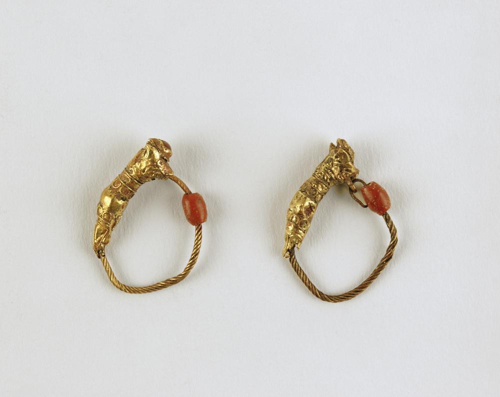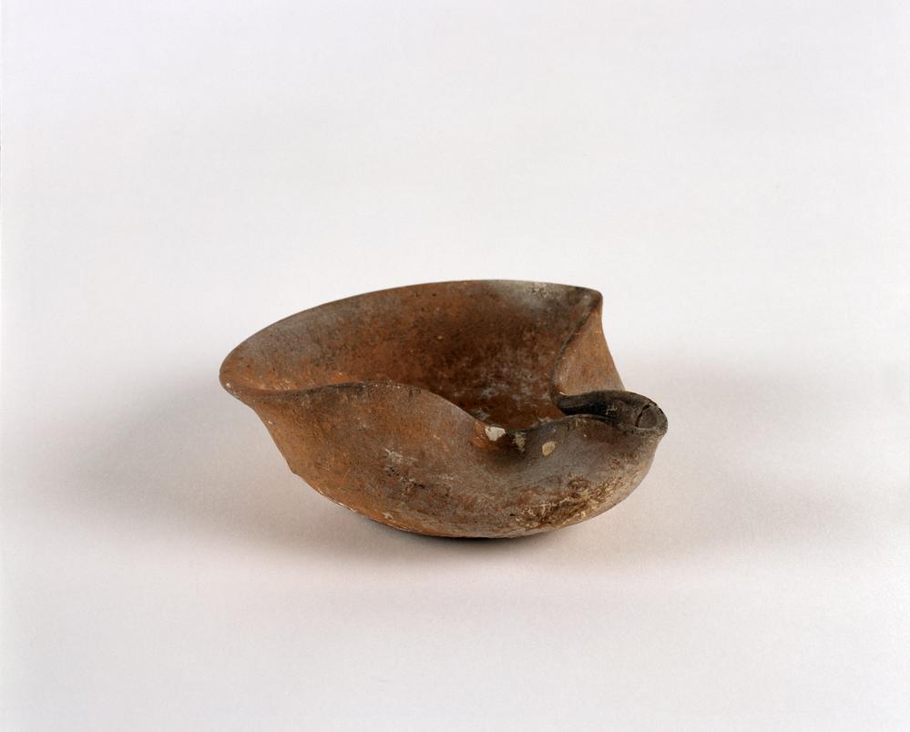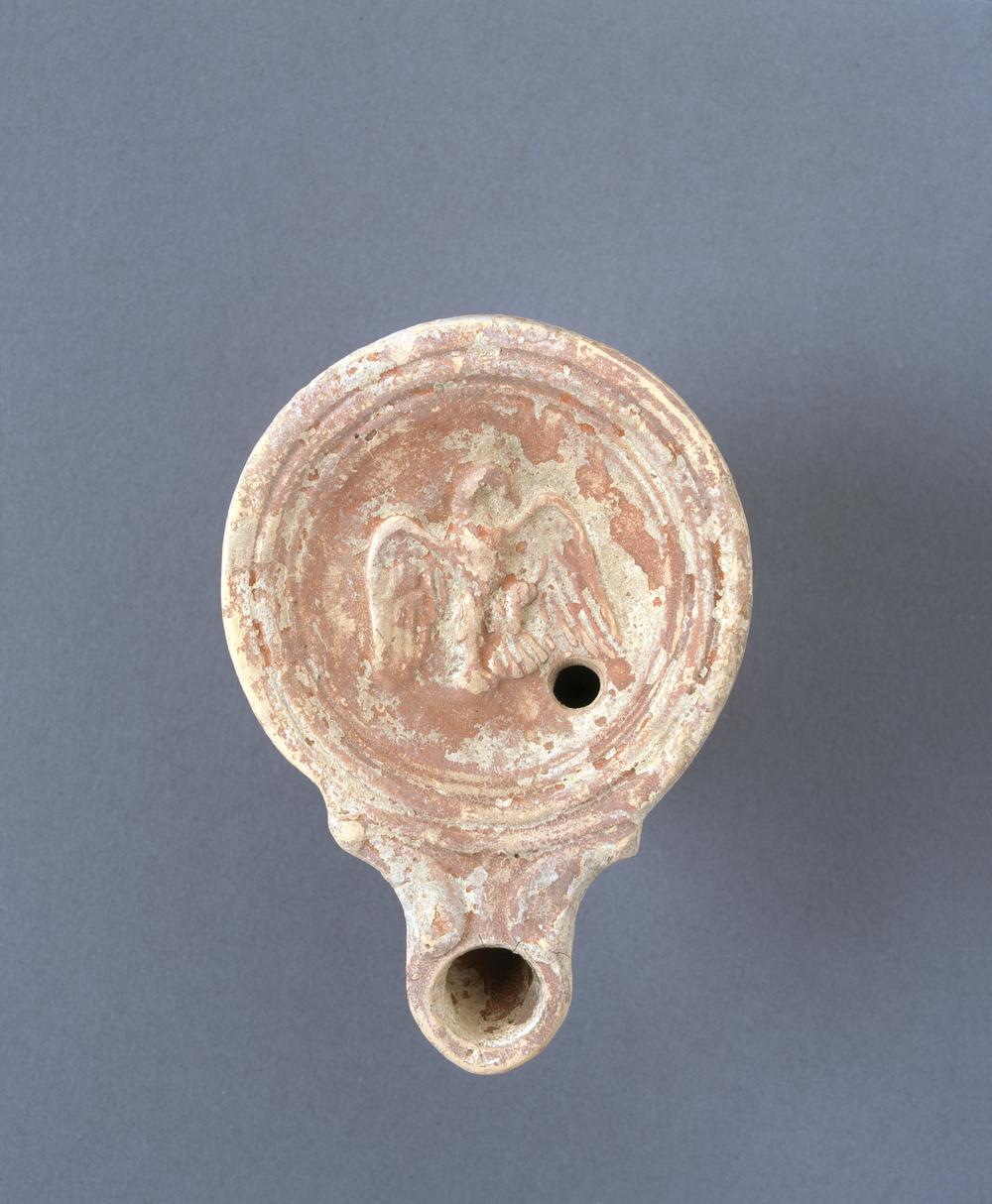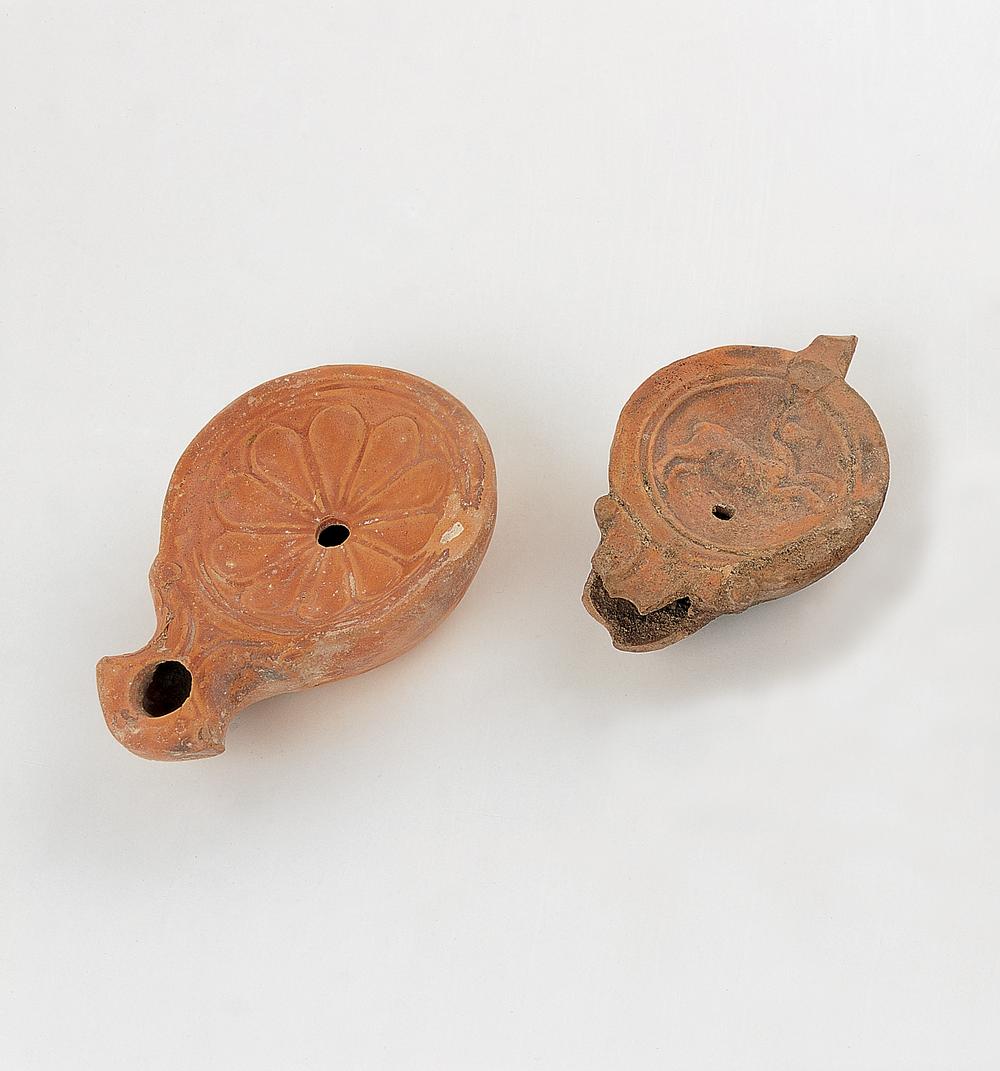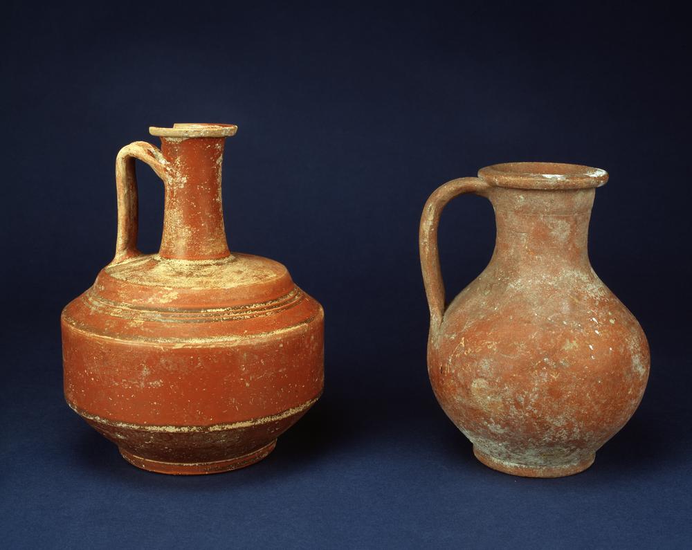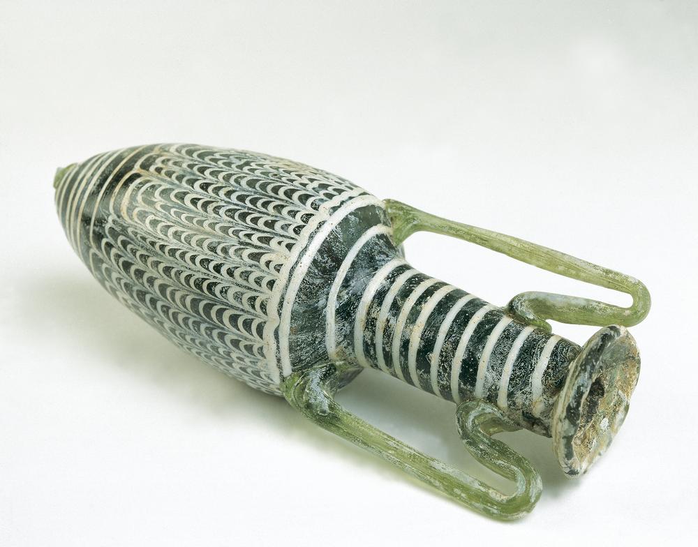 The earliest type of glass production exemplified by the glass amphoriskos involved dipping a core of clay or sand into molten glass. These shapes often imitated ceramic objects. Tall-necked glass vessels were used in funerary contexts to hold perfume or ointment. These are also found in Syria, Palestine and Egypt. Their ‘candlestick’ shape allowed control over the quantity of liquid to be poured. Oil lamps from this period were both imported and made locally.