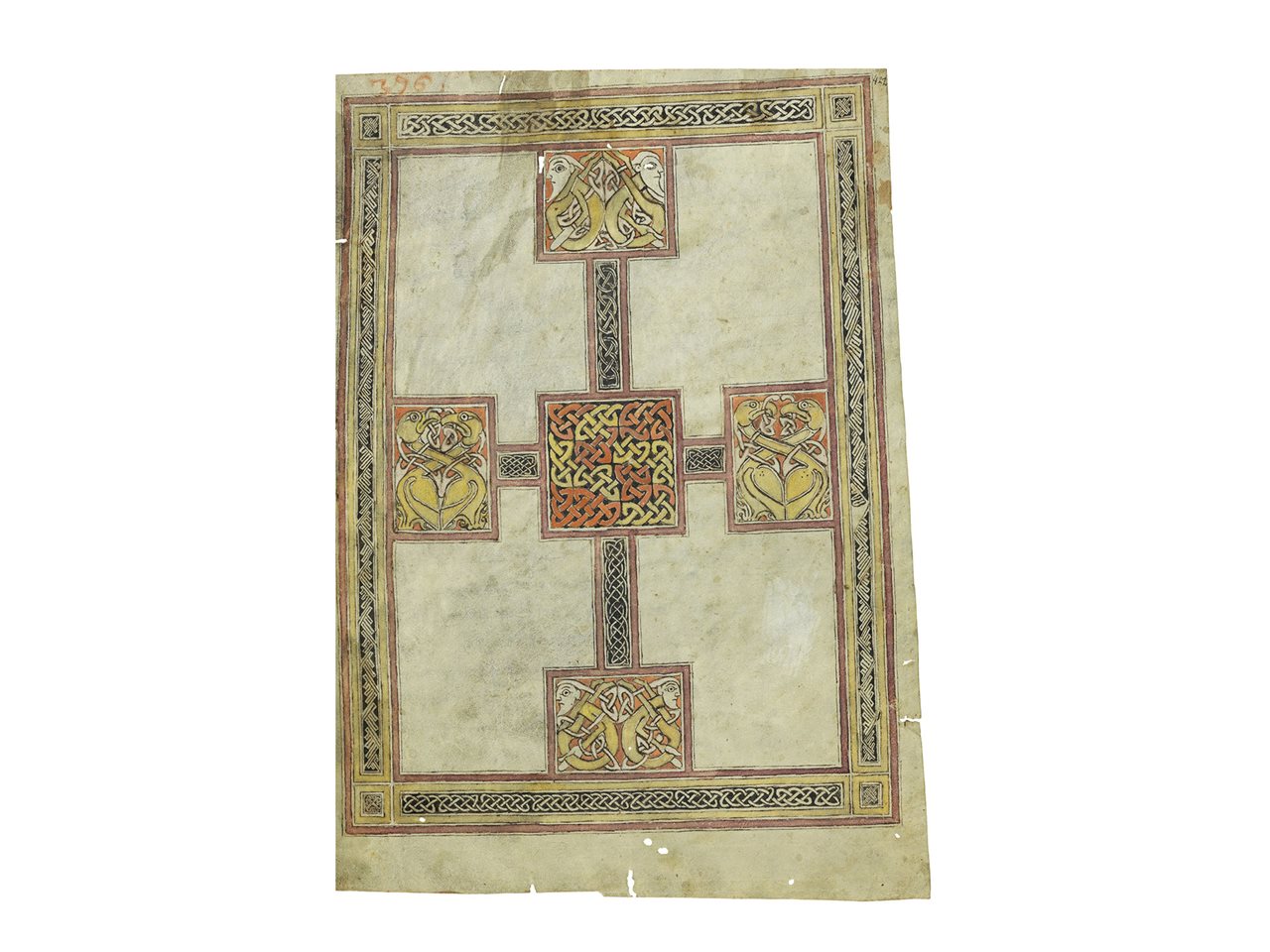 Harbison compared the interlace pattern incorporating the four human figures to the decoration of the initial P on page 3 of the mid-ninth-century St. Gallen Priscian, a copy of a famous Latin grammar book with a large number of comments in Old Irish (Cod. Sang. 904). The book which was probably written in the northeast of Ireland will travel to Dublin for our exhibition. The human figures wrapped in interlace and knotwork also recall those on the ends of a cross on another St. Gallen manuscript fragment coming for our exhibition (Cod.Sang.1395).