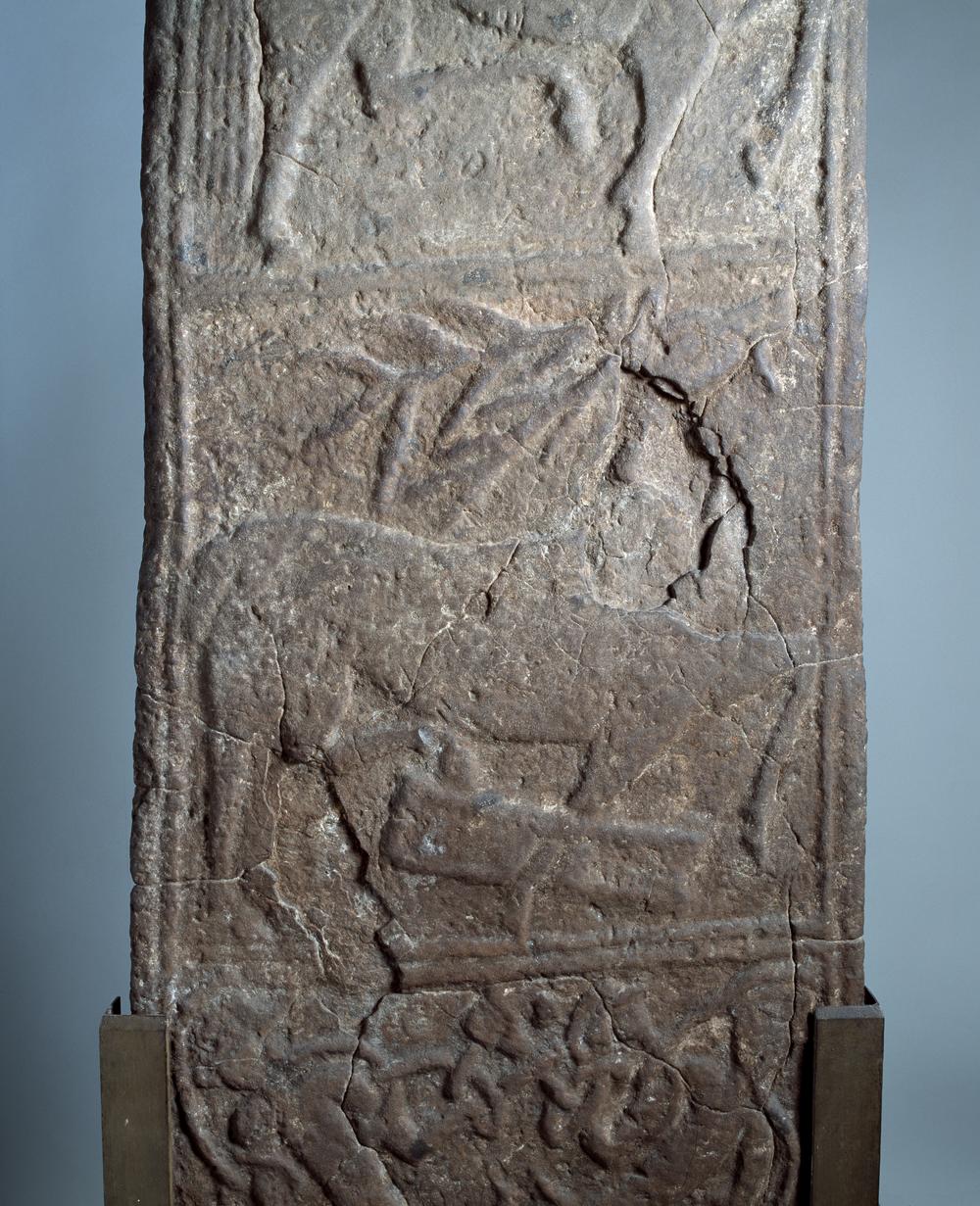 The panels on the other broad face contain: a two-strand interlace motif between animal figures below and the upper bodies of two humans above, their hair linked by a further strand of interlace; a lion with protruding tongue and interlace above; a two-strand interlace pattern.