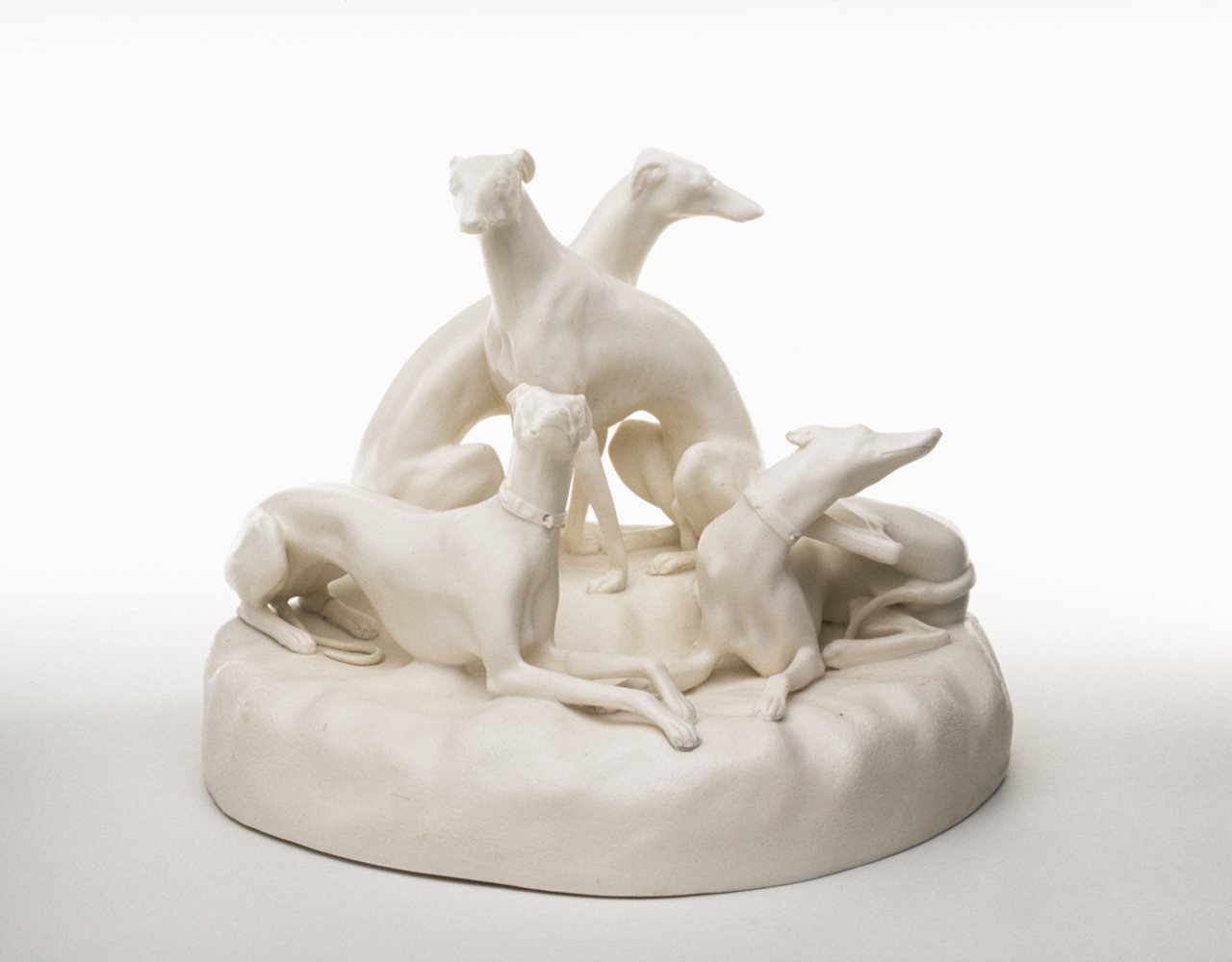 NMIDC:1962.17 Parian group of greyhounds, Belleek, c. 1870