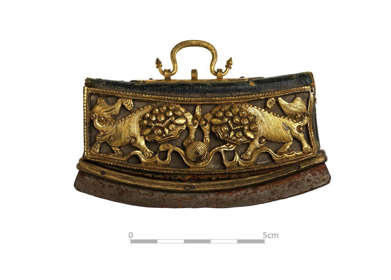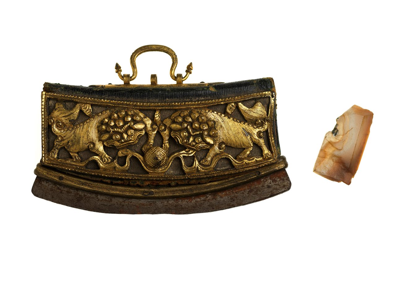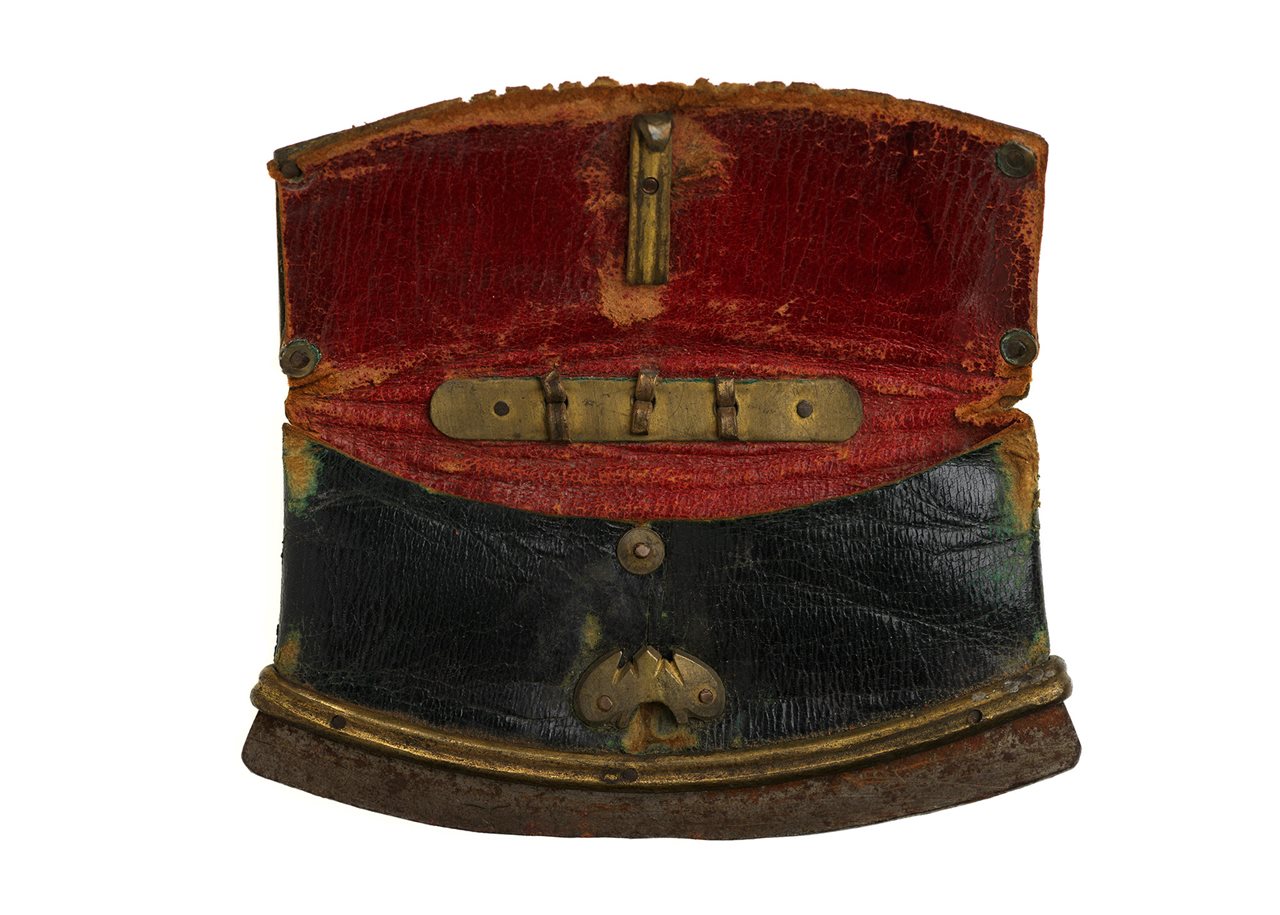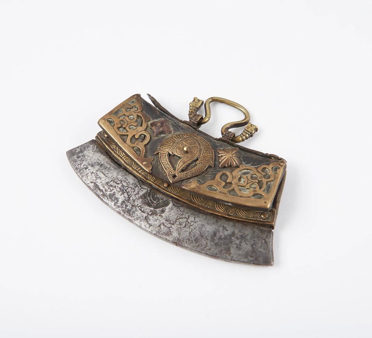 According to the Science Museum Group, decorated leather purses with metal striking plates, similar to this one, were in use in North Asia, China and Japan from the 17th century onwards, they have been particularly associated with Tibet (Fig. 5). The objects have been previously known by the colonial name Chuckmuck, but are now referred to as Menchang pouches, and are seen today across museum collections in Europe. They were potentially picked up by travellers to the East as small portable tokens and brought back to Europe, before making their way into museum collections.