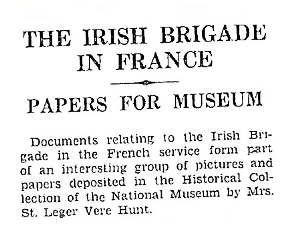 This example was donated to the National Museum in the early 1950s by Ada St. Ledger Vere Hunt. Mrs. St. Ledger Vere Hunt was the daughter of military captain George Durdin of Shangarry Castle, Cloyn, Co. Cork, she had previously donated a collection of her father’s military papers in the 1940s. That event is recorded in an article by the Irish Independent in 1940 (Fig. 6) which states that the Regimental papers “relate to the Irish Brigade in the French Service” and that they were inherited by Mrs. St. Ledger Vere from her father.