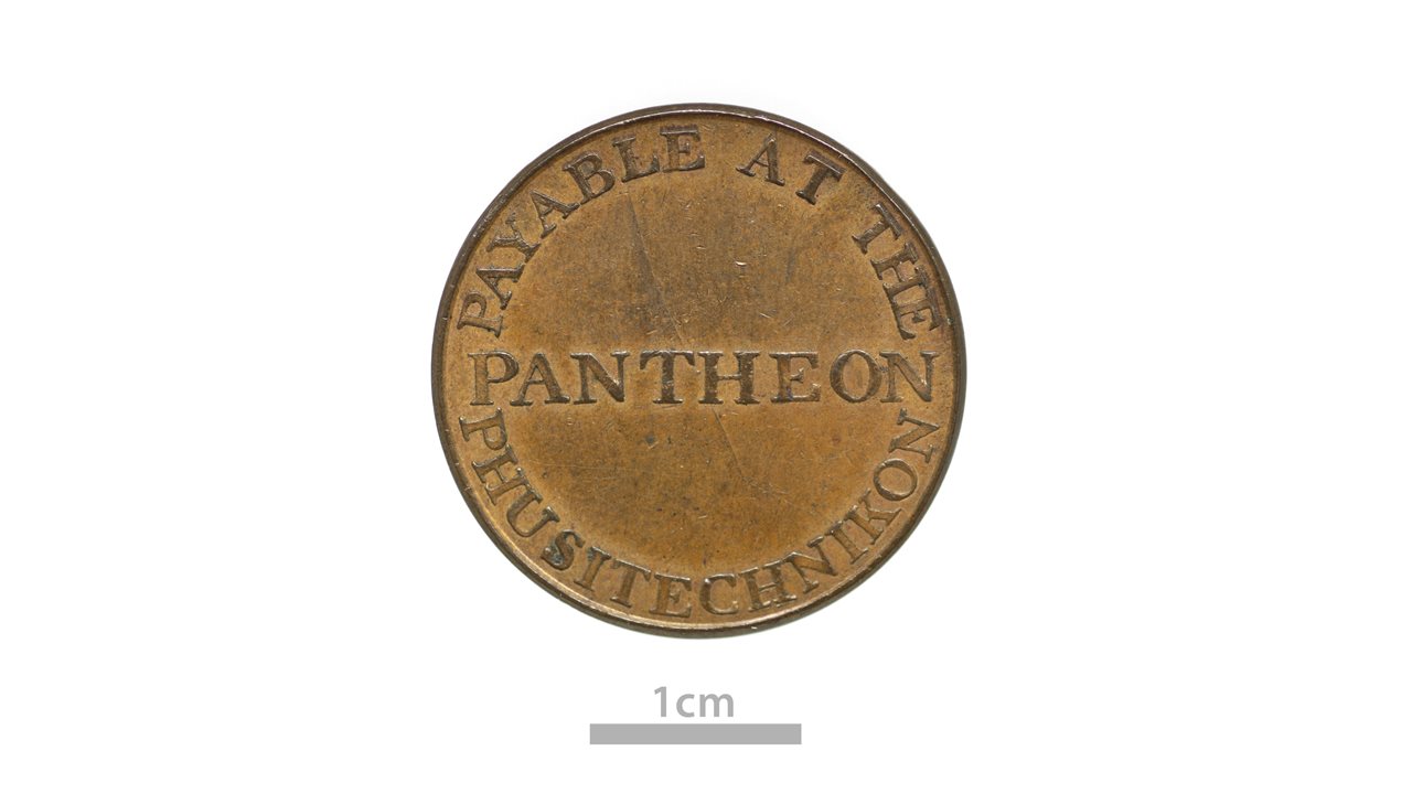 I have always had an interest in commercial history. Commerce was and is the beating heart of society. Everyone at some point uses and buys things. Everyday objects can teach us about the way people lived. They are a very physical historical source, that have been held and used by ordinary people. This blog is about one of the smallest of these objects: Trade tokens. We have a large collection of them in the National Museum of Ireland’s Art and Industry Division, almost 5,000. They offer little snapshots of history such as NMIHC:1937.126.11, a trade token for McSwiney, Delaney & Co, Lr Sackville St, 1853. This was the precursor to Dublin’s famous Clery’s Department Store, and it was established in 1853, the year that is given on this coin. Another token (NMIHC:1909.1584) is payable at the PANTHEON PHUSITECHNIKON, 1799. This was an unusual Dublin building on the corner of Kildare Street and Stephen’s Green. It had a viewing tower with windows all around it, from which you could see across the city. It was a huge toy shop, and you can picture the excitement of a child who was given a token to spend there. There is so much history in one little token. It was demolished in the mid-19th century, but its image lives on in this token.