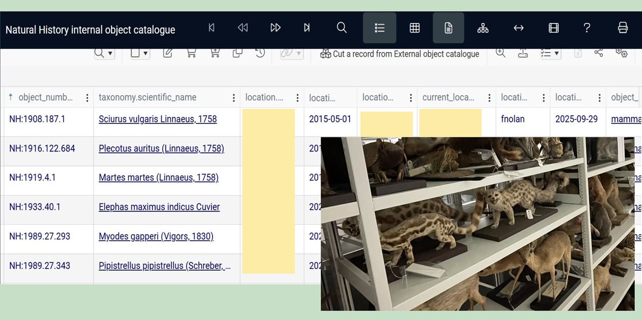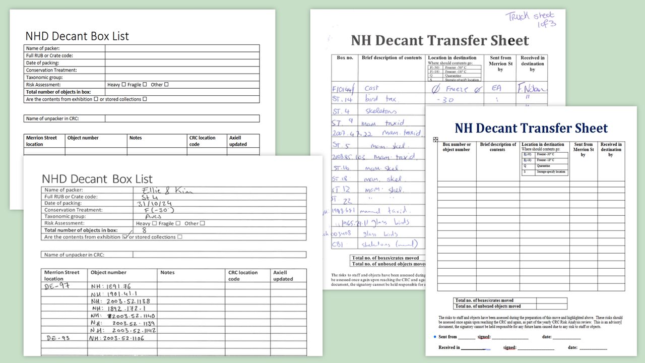 Fig. 1 A collage of case lists, box list, transfer sheets and snip of some Axiell location updates from the Natural History Decant. Research image by Faith Nolan © National Museum of Ireland
