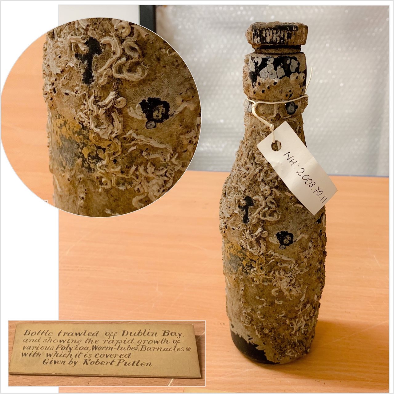 Another object with an interesting past was a bottle found by Robert Pullen while trawling off Dublin Bay. It showed the rapid growth of various bryozoans, barnacles and the cases of tube worms, so he gave it to the Museum. The Museum not only kept it, but even had it on display for a while.