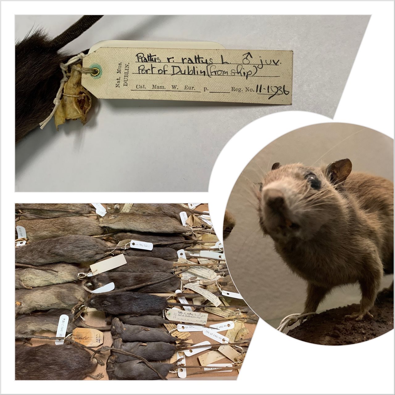 We have also received specimens from other Irish government entities. In 1935 three rats were found as stowaways on a ship docked in Dublin Port by Mr. Tannam, an employee of the Disinfection Department of Dublin Corporation. He brought them to the Museum where they were mounted (prepared as a taxidermy specimen). One was put on display in the Dead Zoo – where it resides to this day.