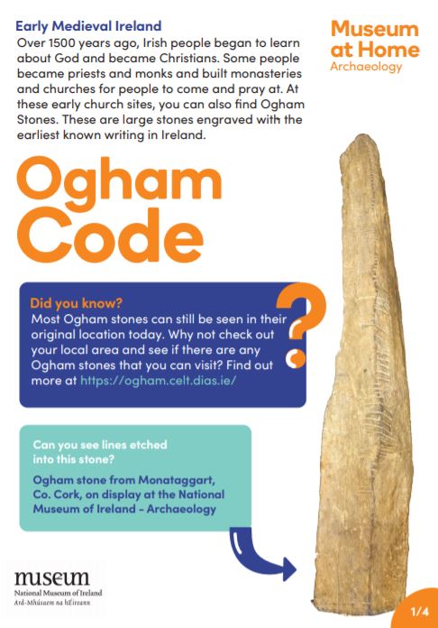 When you have created your Ogham Stone, why not let us know how you got on by emailing educationarch@museum.ie or post a photo online through Facebook, Twitter or Instagram using #MuseumAtHome.