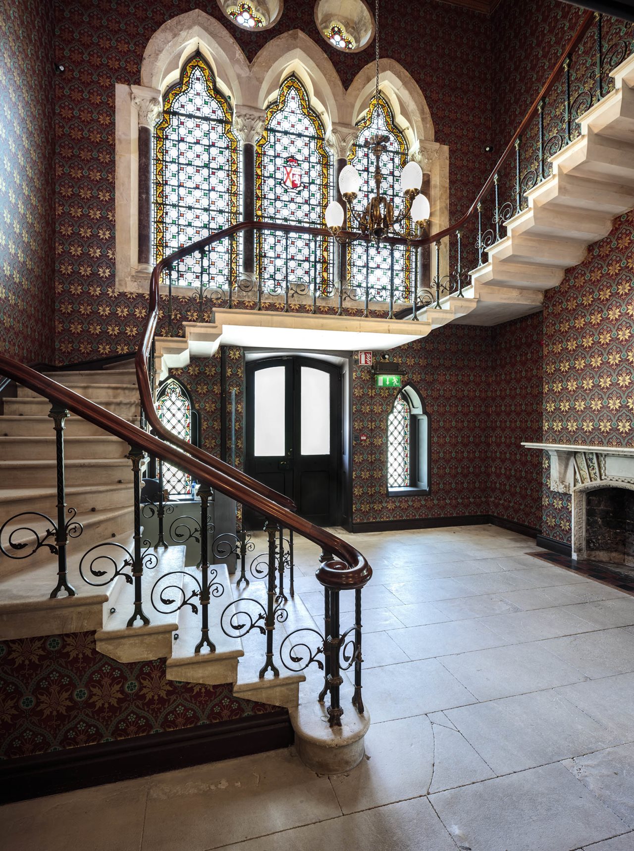 An imposing stained glass window above the porch incorporates the Fitzgerald family crest and bears the motto Honor Probataque Virtus (Honour, Probity & Virtue).