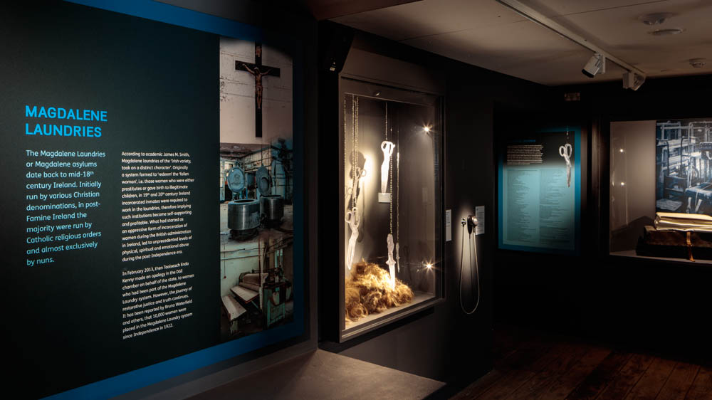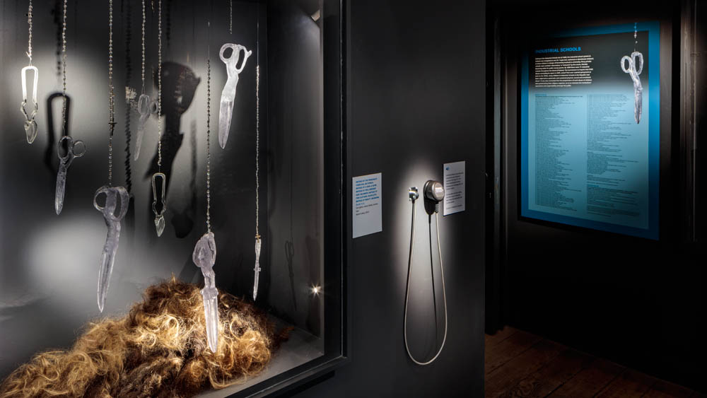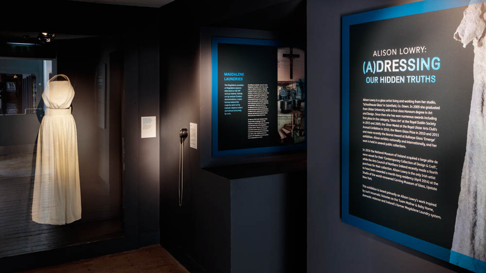Amongst the exhibition's highlights is an installation of nine christening robes in pâte de verre (glass paste) spread across two rooms - a profound piece of commentary on the Tuam Mother and Baby Home revelations. Other elements of the exhibition include audio testimony by way of poetry and song from those who experienced the industrial school system and Magdalene Laundries.
