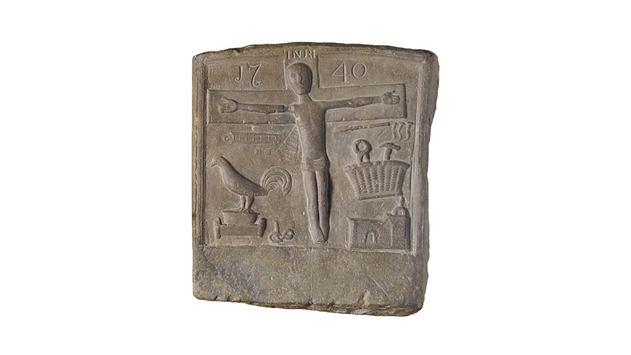 In contrast, a stone nearby is simply carved with the symbols of the Passion of Christ. For centuries, and in an international context, both the poor and the wealthy meditated through reading these symbols. Tradition says that this locally-carved stone was found in a small walled-up room in Summerhill, Co. Meath. Dated 1740, it has been suggested that it was an altar stone used during the penal period, when Mass was said furtively in such homes and at mass rocks.