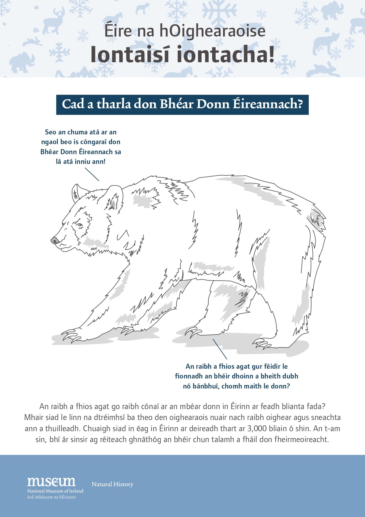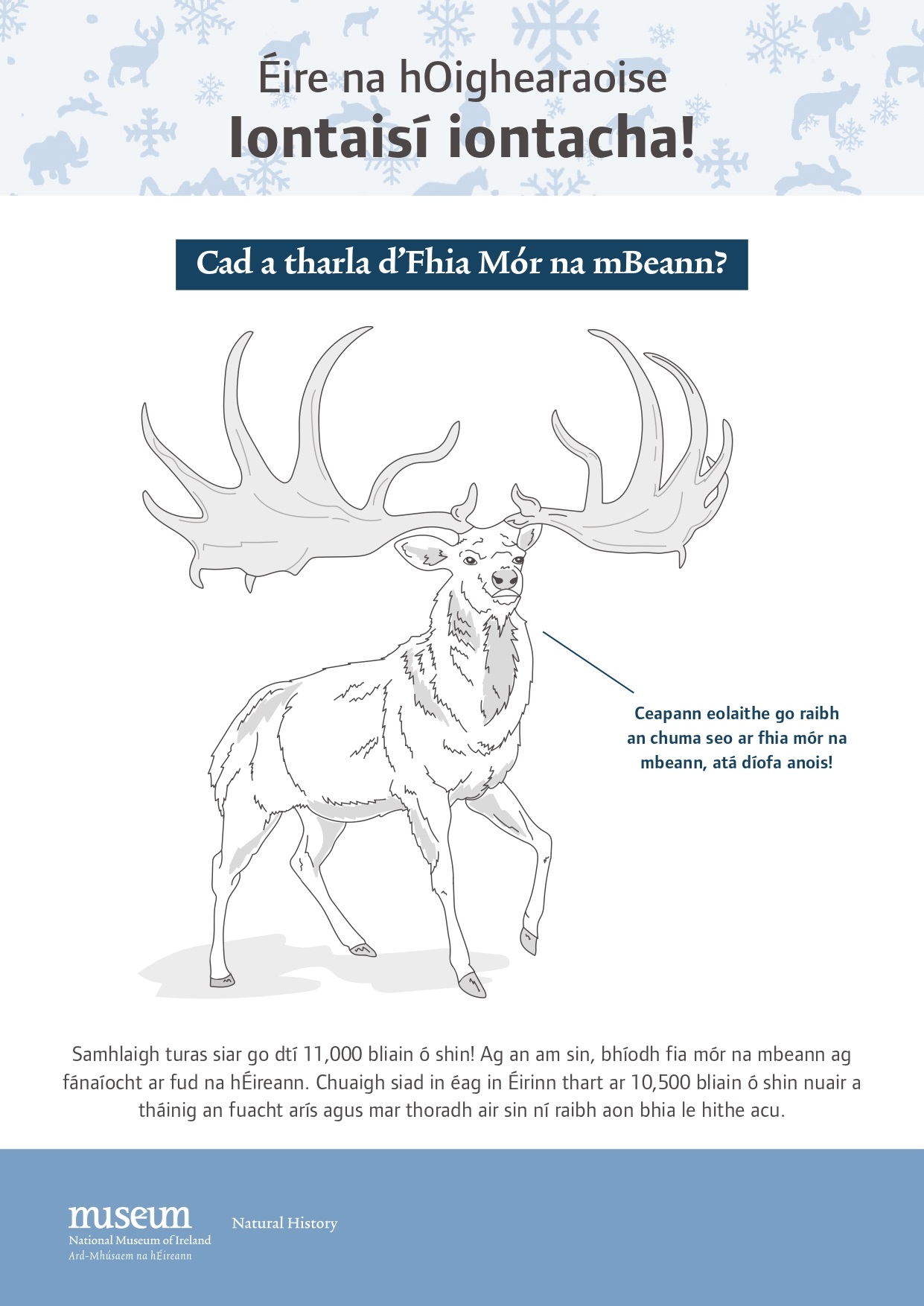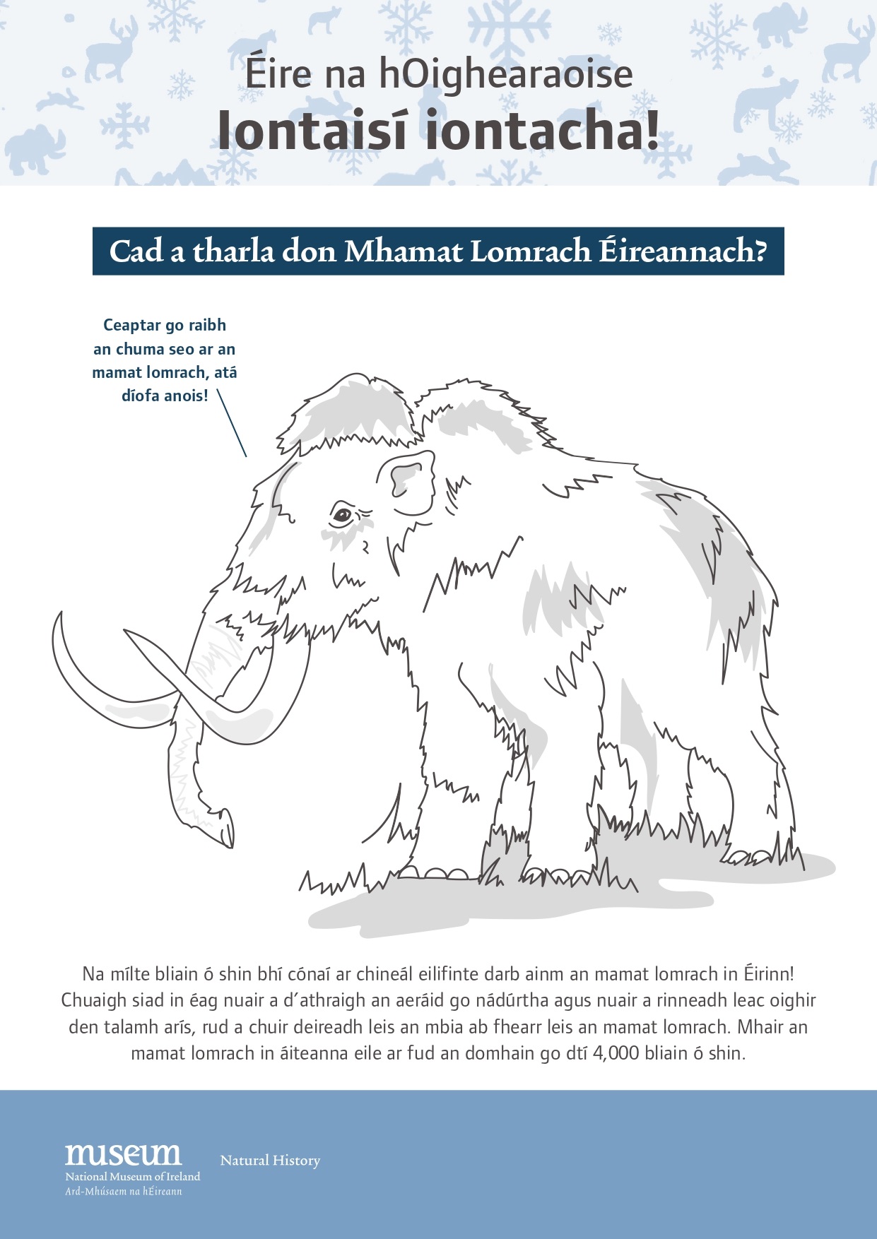 An ndearna tú iontas riamh de na cineálacha ainmhithe ársa a bhí ar leac an dorais againn na mílte bliain ó shin? Sa ghníomhaíocht Músaeim seo, déanfaimid iniúchadh ar Oighearaois na hÉireann, foghlaimeoimid faoi iontaisí i mbailiúchán an Mhúsaeim agus faoi na cineálacha éagsúla ainmhithe a bhí ina gcónaí anseo san am a chuaigh thart.
