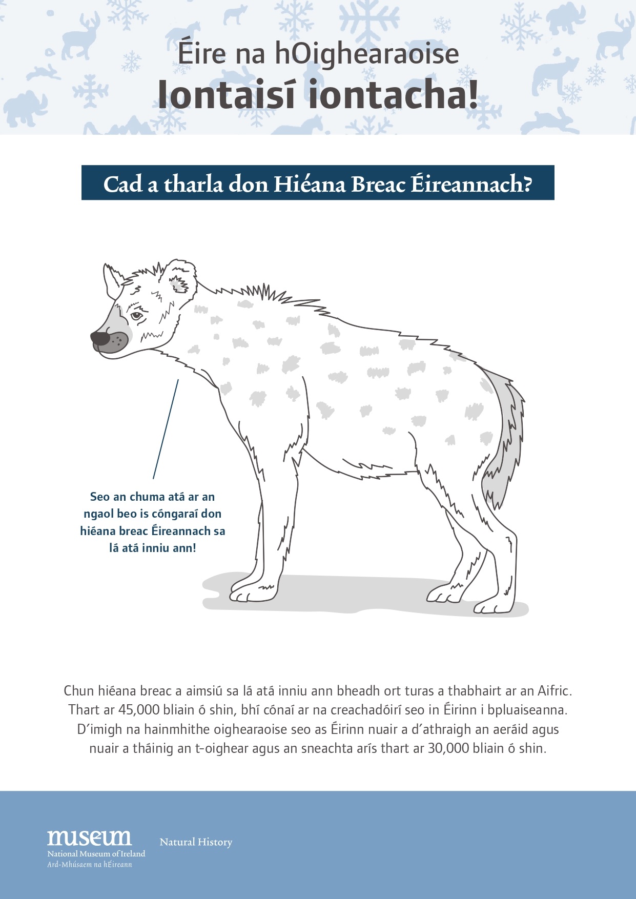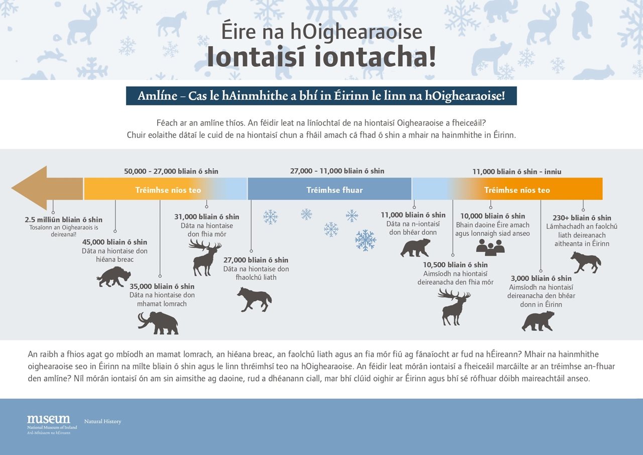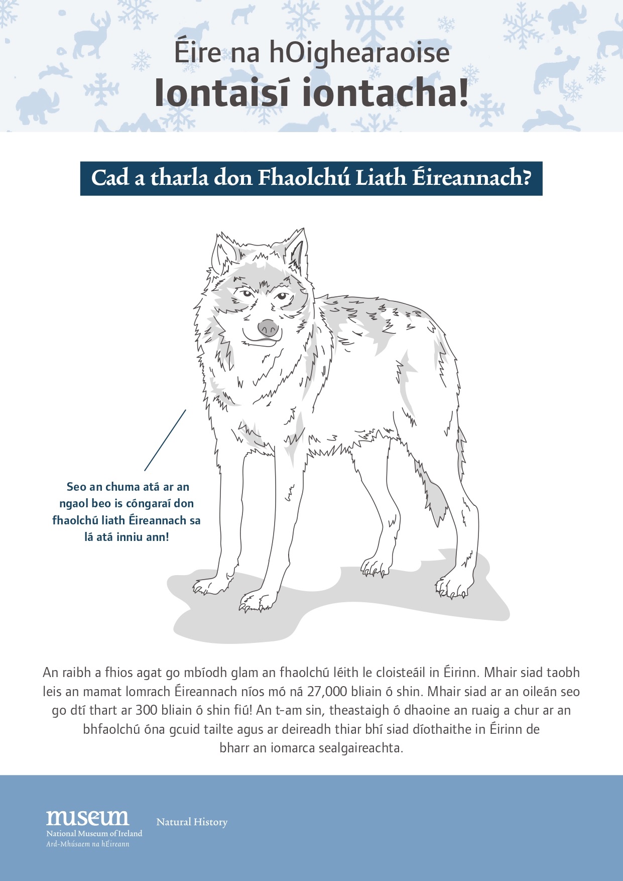 An ndearna tú iontas riamh de na cineálacha ainmhithe ársa a bhí ar leac an dorais againn na mílte bliain ó shin? Sa ghníomhaíocht Músaeim seo, déanfaimid iniúchadh ar Oighearaois na hÉireann, foghlaimeoimid faoi iontaisí i mbailiúchán an Mhúsaeim agus faoi na cineálacha éagsúla ainmhithe a bhí ina gcónaí anseo san am a chuaigh thart.