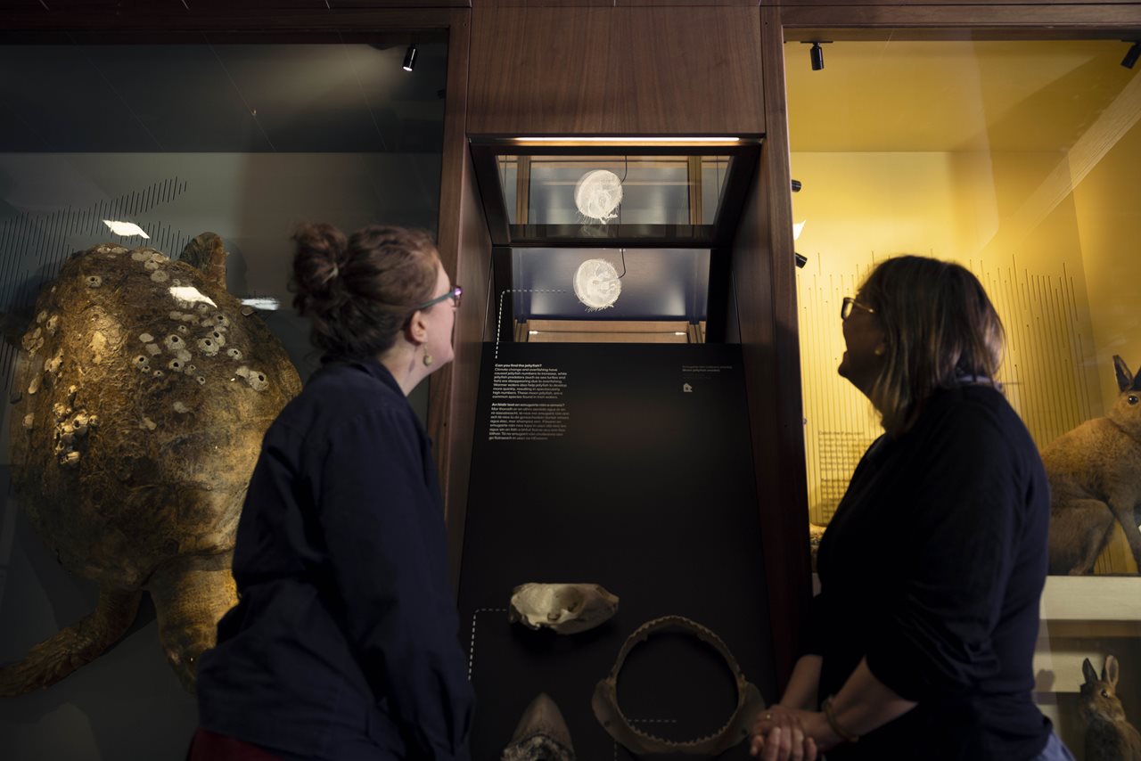 The moon jellyfish model is located at The Wonder Cabinet on the Ground floor of the Museum. When you visit The Wonder Cabinet you will see predators and prey, side by side such as the huge loggerhead sea turtle, alongside one of its favourite food, the moon jellyfish!