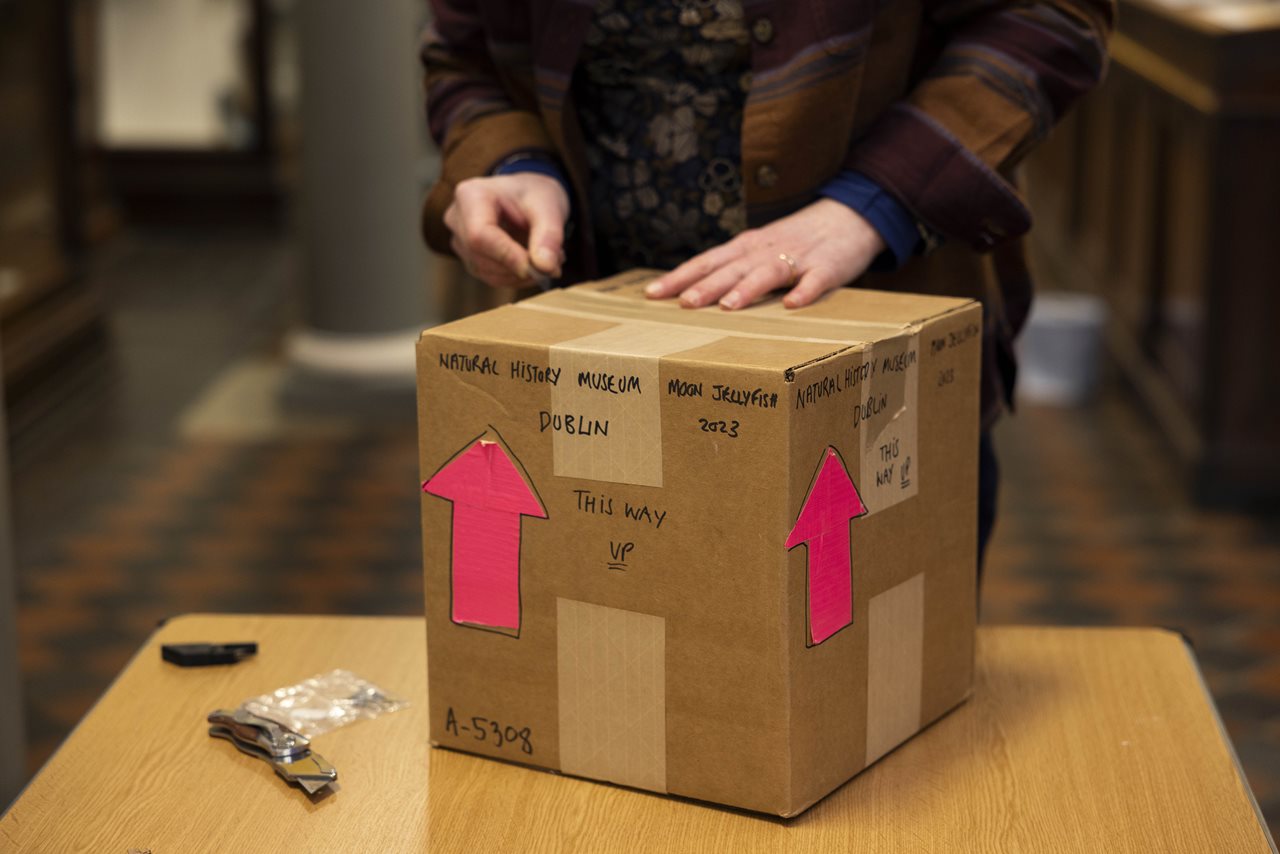 In the National Museum of Ireland at Merrion Street, we also have real jellyfish on display. Since jellyfish are mostly made up of water there is no such things as jellyfish taxidermy! In museums, jellyfish are preserved as ‘Wet Collections’ in jars of liquid spirit. This spirit mixture means they don’t decay and instead can be used in on-going important scientific research. You can see some examples of these on display on the ground floor of the Museum, such as a compass jellyfish, barrel jellyfish, blue jellyfish, the mauve stinger and even a moon jellyfish.