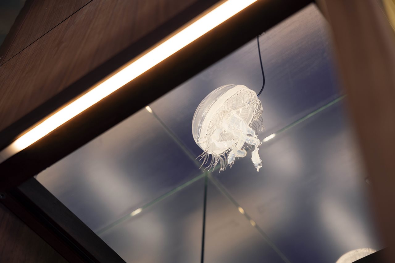 The fragile model is displayed at a height and designed to be viewed from below, or through a mirror, to give the viewer an unusual perspective and not unlike how we often encounter real-life jellyfish, while swimming in our coastal waters.