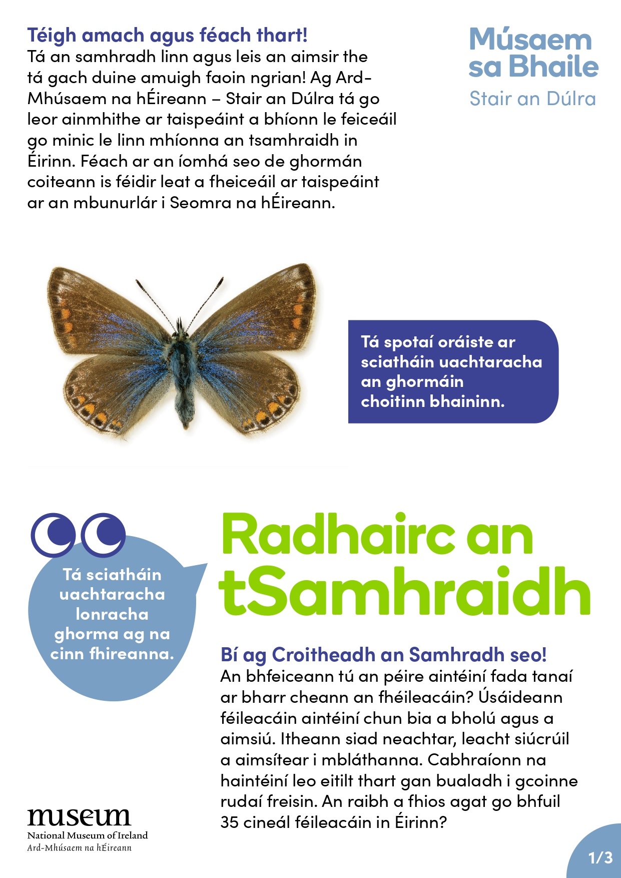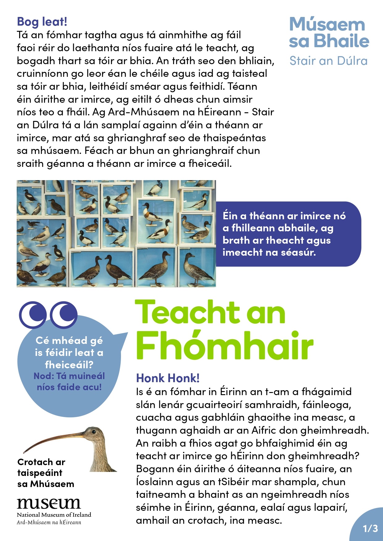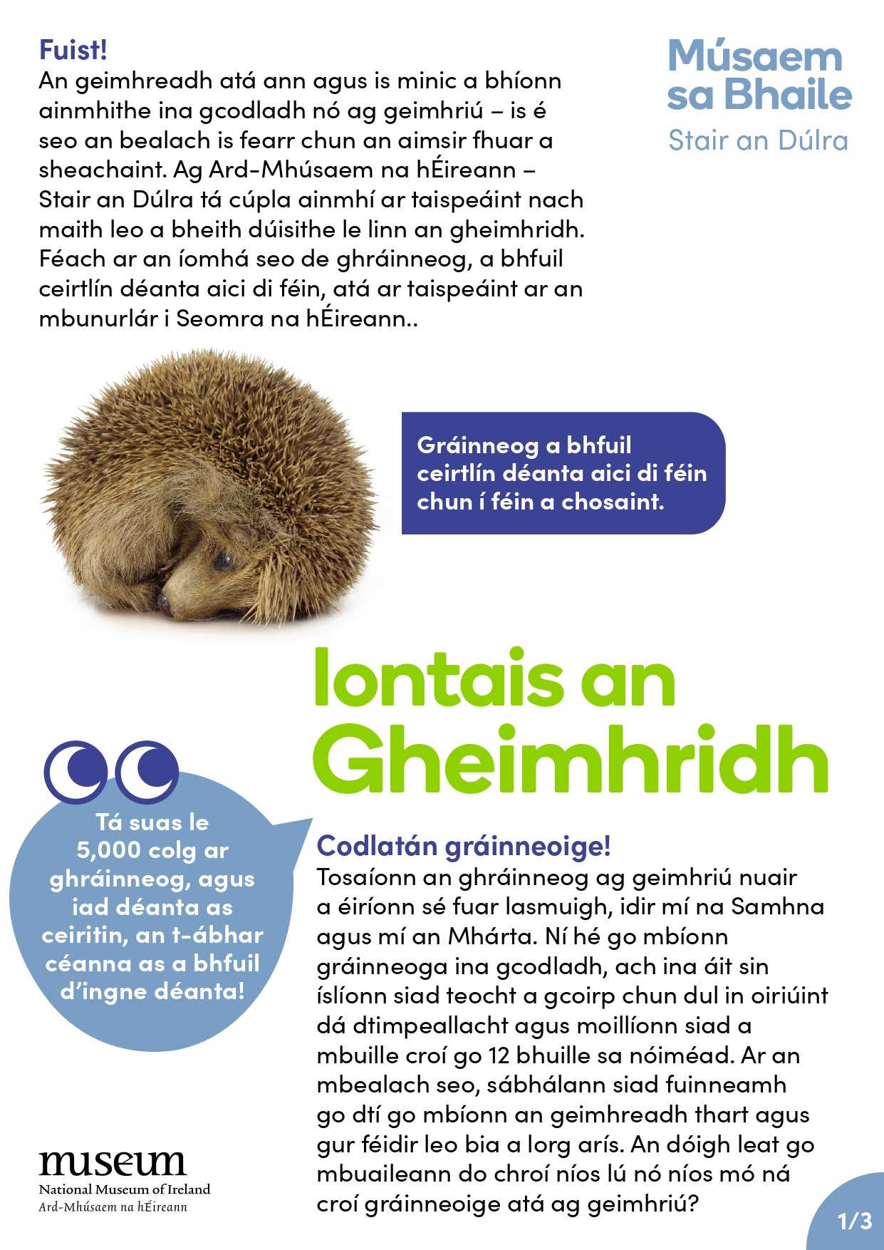 Cuir eolas ar bhailiúcháin Ard-Mhúsaem na hÉireann – Saol an Dúlra trínár mbileoga nua gníomhaíochta as Gaeilge. Iarr ar do dhaltaí triail a bhaint as na cuardaigh seo d'fhocail shéasúracha chun cur lena gcuid foclóra, agus an litriú agus an cumas díriú ar an obair a fheabhsú, agus iad ag cur eolais ar an dúlra sa Mhúsaem.