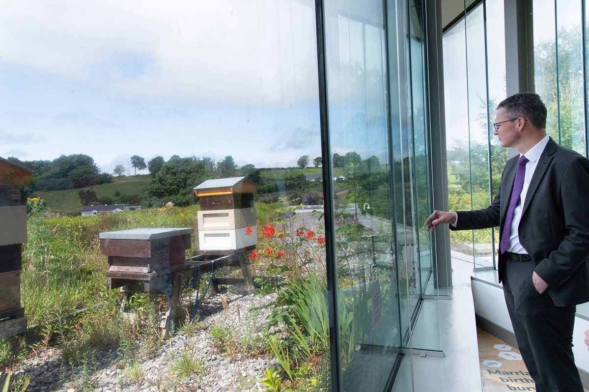 Image: Minister Patrick O’Donovan views the rooftop beehives during his tour of the National Folklife Collection at Turlough Park. Image: Alison Laredo