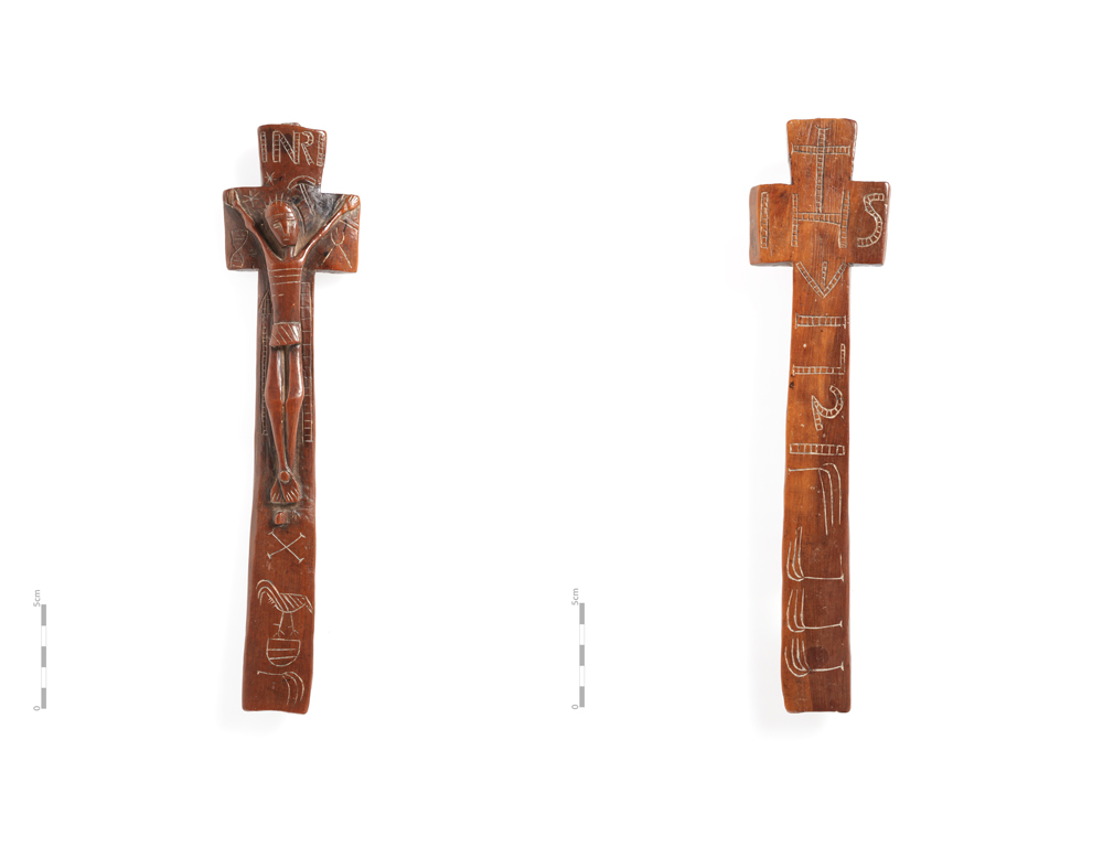 Tá poll crochta ar iarraidh ó bharr na croise agus taobh thíos de tá an INRI seo agus an N agus R ceangailte. I rilíf atá an mhionfhíor de Chríost agus faoi bhun na gcos is féidir go raibh cloigeann i rilíf. I measc na Siombailí de Pháis Chríost atá greanta ar aghaidh na croise tá dhá réalta, casúr, pionsúir, cailís, dréimire, sleá agus ar an mbun tá léiriú de chroschnámha, coileach ag éirí as pota agus sciúirse trí lasc.