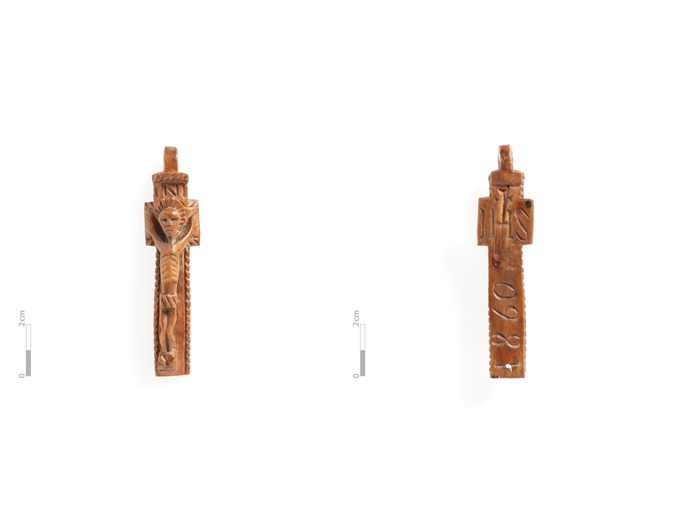 Is cros bheag í le poll crochta agus INI greanta ar a barr, ach tá an R ar iarraidh. Tá fíor de Chríost ar an gcuid is mó den chros agus níl aon siombail eile greanta uirthi.