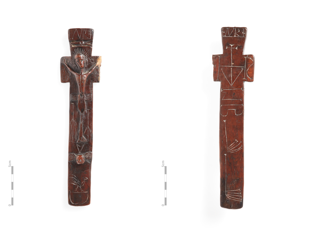 Tá INRI agus 1713 agus IHS greanta ar an gcúl. Tá trí thairne agus dhá sciúirse cúig lasc ann, leis.
