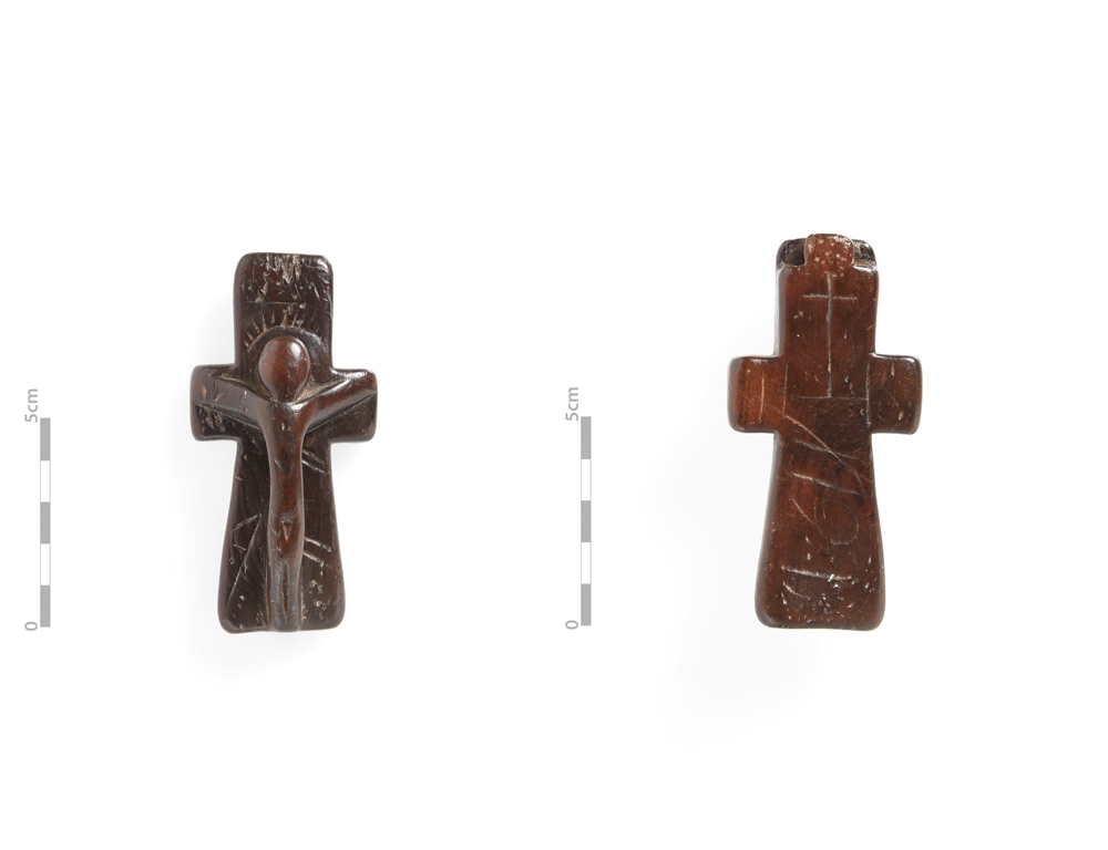Eiseamláir bheag le fíor stílithe de Chríost greanta ar an aghaidh; tá poll crochta air. Is féidir gur lansa agus dréimire garbh na dearthaí eile atá greanta air.