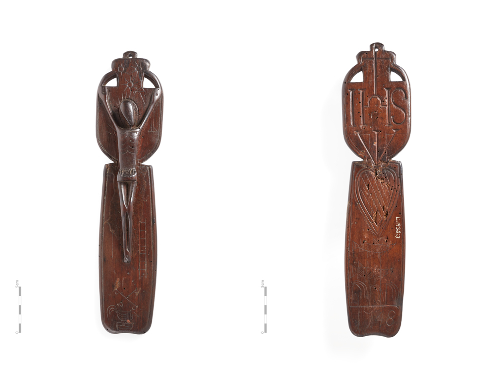 Cros Péindlíthe neamhchoitianta sa mhéid is go bhfuil Críost i rilíf ar an aghaidh agus na siombailí seo a leanas greanta ar an aghaidh: trí réalta, mainipil, sleá, dréimire, Cros San Aindriú, coileach agus pota.